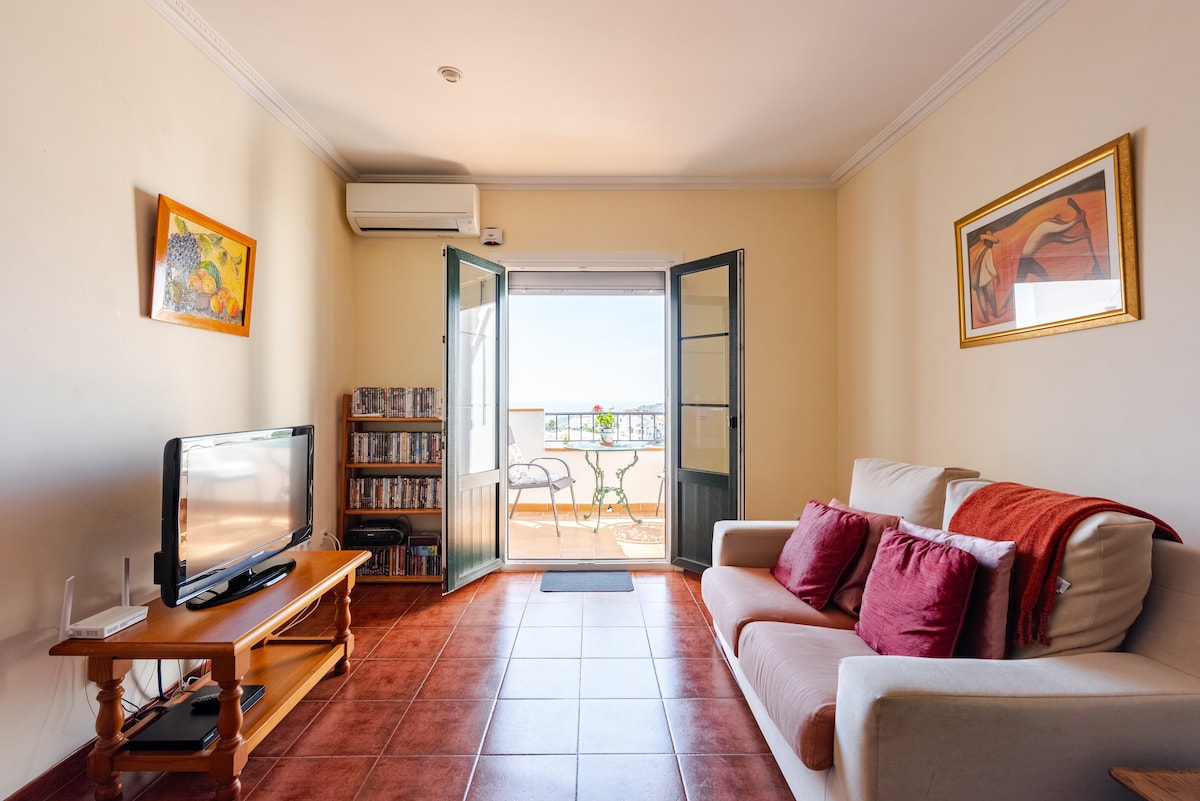 Comfortable and spacious accommodation for up to four people. Both bedrooms and living room and terrace have views down to the lovely seaside town of Nerja and the Mediterranean Sea. We have a fully equipped kitchen for all your self catering needs, however the village offers an excellent choice of restaurants most of which are a short walk away from the apartment.