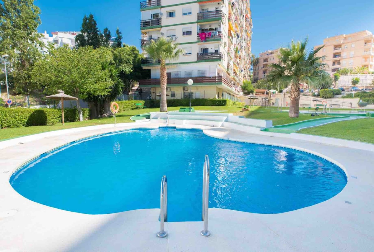 Lovely Studio, fully renovated with nice views to the pools . Very bright and sunny (afternoon sun). 1ST FLOOR. Only short walking distance to the beach (10 min on foot) and close to La Paloma Park and the famous Bonanza Square, very popular for tourists. Arroyo de la miel center and commuter train is around 500 meters away (15 min on foot). La Marina are around 15 min on foot. The biggest pool is only open on summer. Important: All the Pools are closed now.
