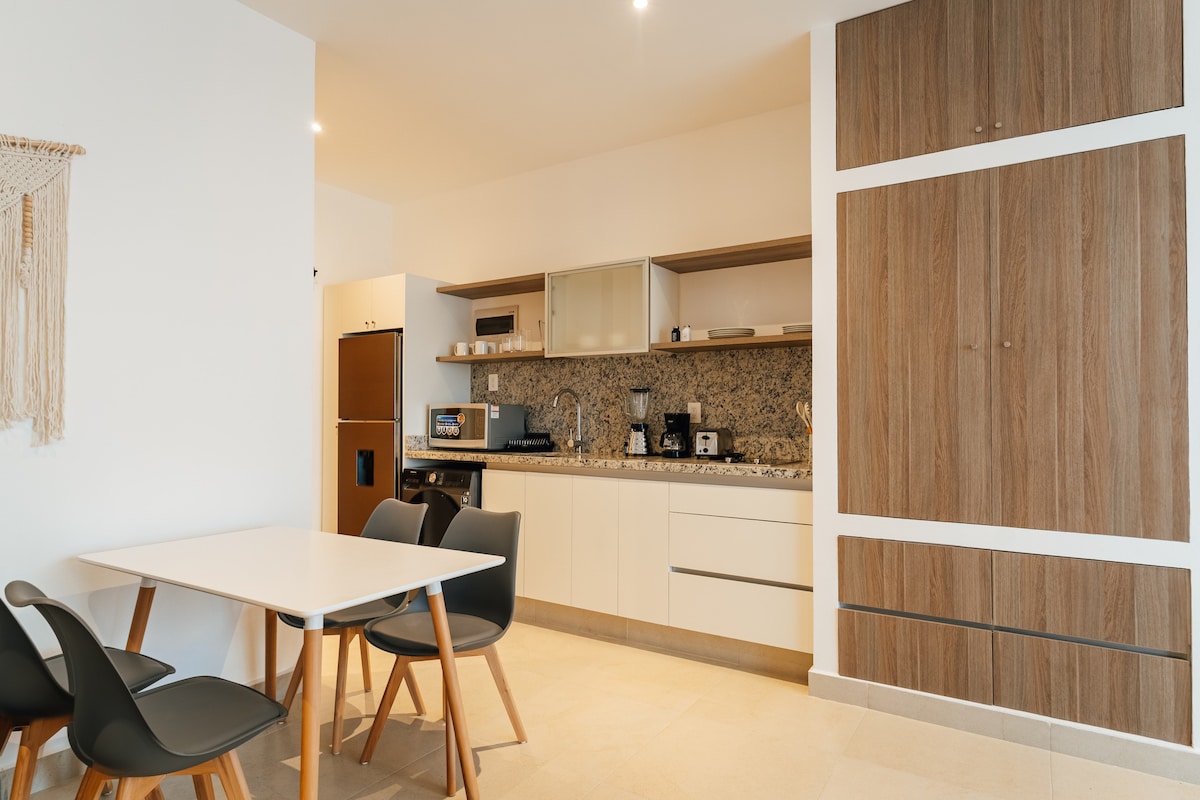 地理位置優越,位於PDC市中心。 距離昆塔大道( Quinta avenida )僅幾步路,非常適合購物和用餐,如果您計劃在加勒比海旁放鬆一天,並為那些喜歡水肺潛水和水上運動刺激的人提供前往Cozumel sland的渡輪。 單間公寓裝潢精美,設計時尚的開放空間區域。 設備齊全的廚房,適合烹飪愛好者。 乾淨和現代化的浴室。房客將擁有最大的舒適度和最大的隱私。