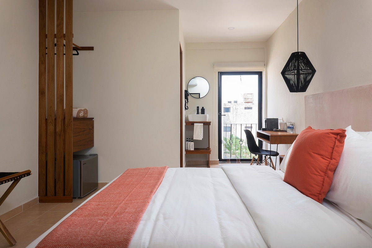 Nuestra habitación con cama matrimonial y balcón es muy acogedora y tiene un bonito diseño; hotel boutique que puede incluir limpieza dos veces por semana si así lo deseas. Perfecta para parejas.