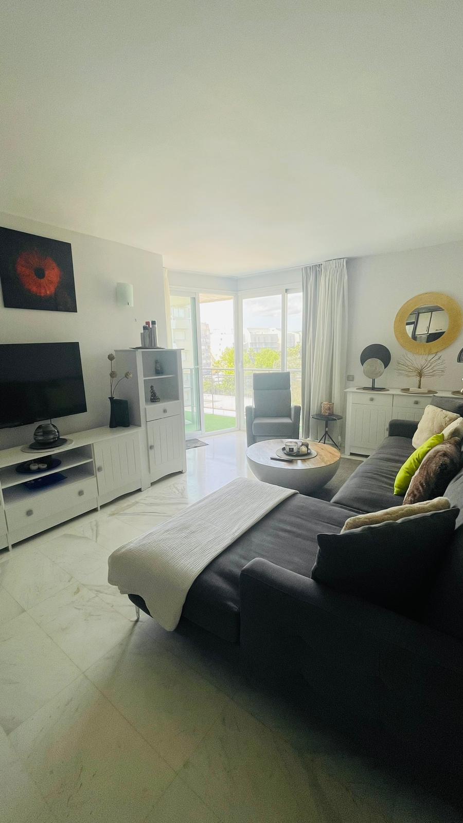 Elegant, spacious apartment in the heart of Marina Botafoc, modern stile , wooden parquet, big covered terrace, garden view, private covered parking place inside the building, silent, quite area , 3 min walking distance from Pasha disco club, club Chinoise and other clubs and port of marina Botafoc , 10 min walk to Talamanca beach. 2 bedrooms, 2 bathrooms , one in suite, open kitchen, huge covered terrace, garden view, silent