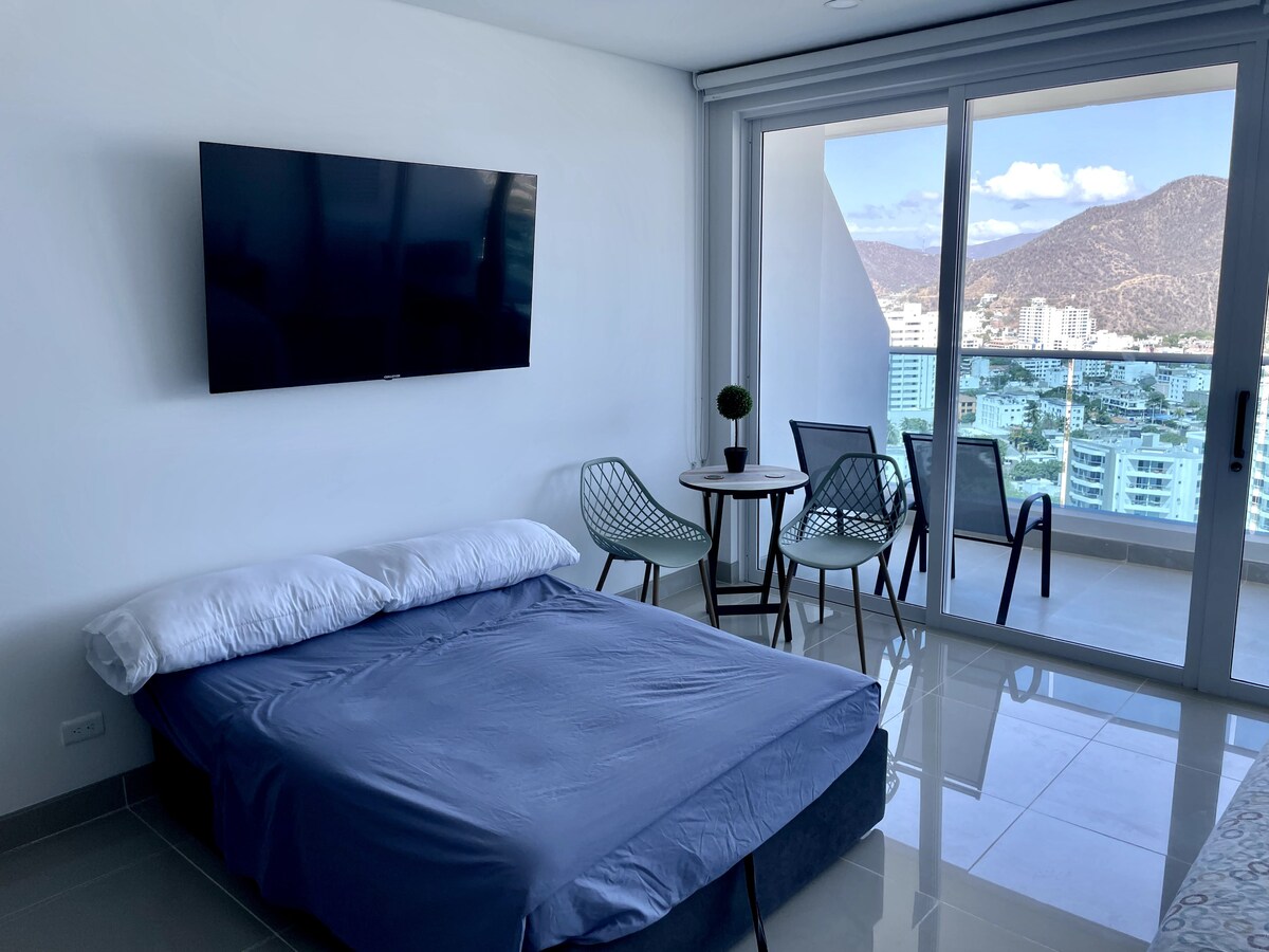 位於獨家 EL PEÑON-RODADERO BILDING 赫莫薩維斯塔 One Atmosphere 400 Mbps WiFi 4樓 32 公尺2 可容納 2 至 4 人* 陽臺 2個全景泳池- 不可攜帶寵物 不建議行動不便者參加 兒童網球區 沒有熱水(聖瑪爾塔有44度) 是的,有空調 不包含的價值: 每人每次住宿35,000比索( 6美元)的登記價值。 進入大樓時應付款。