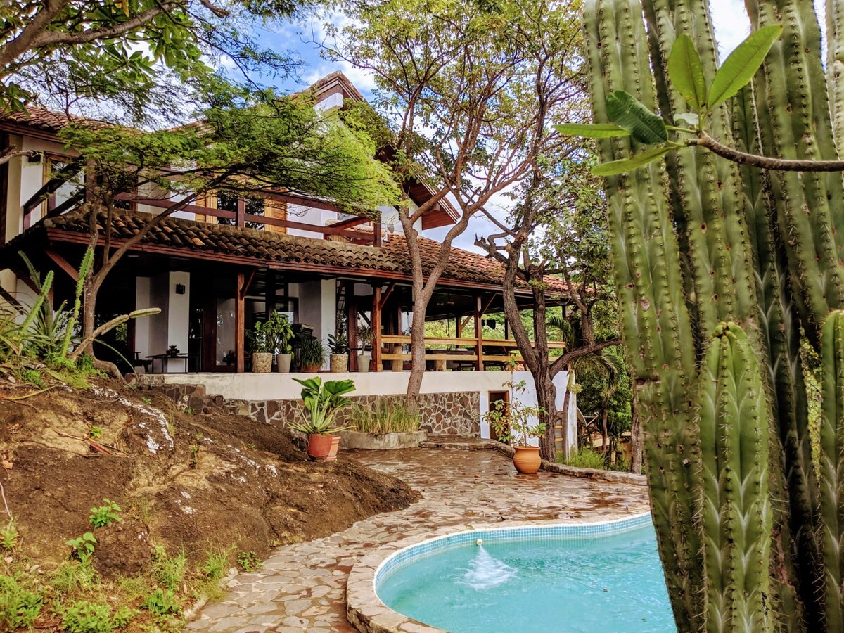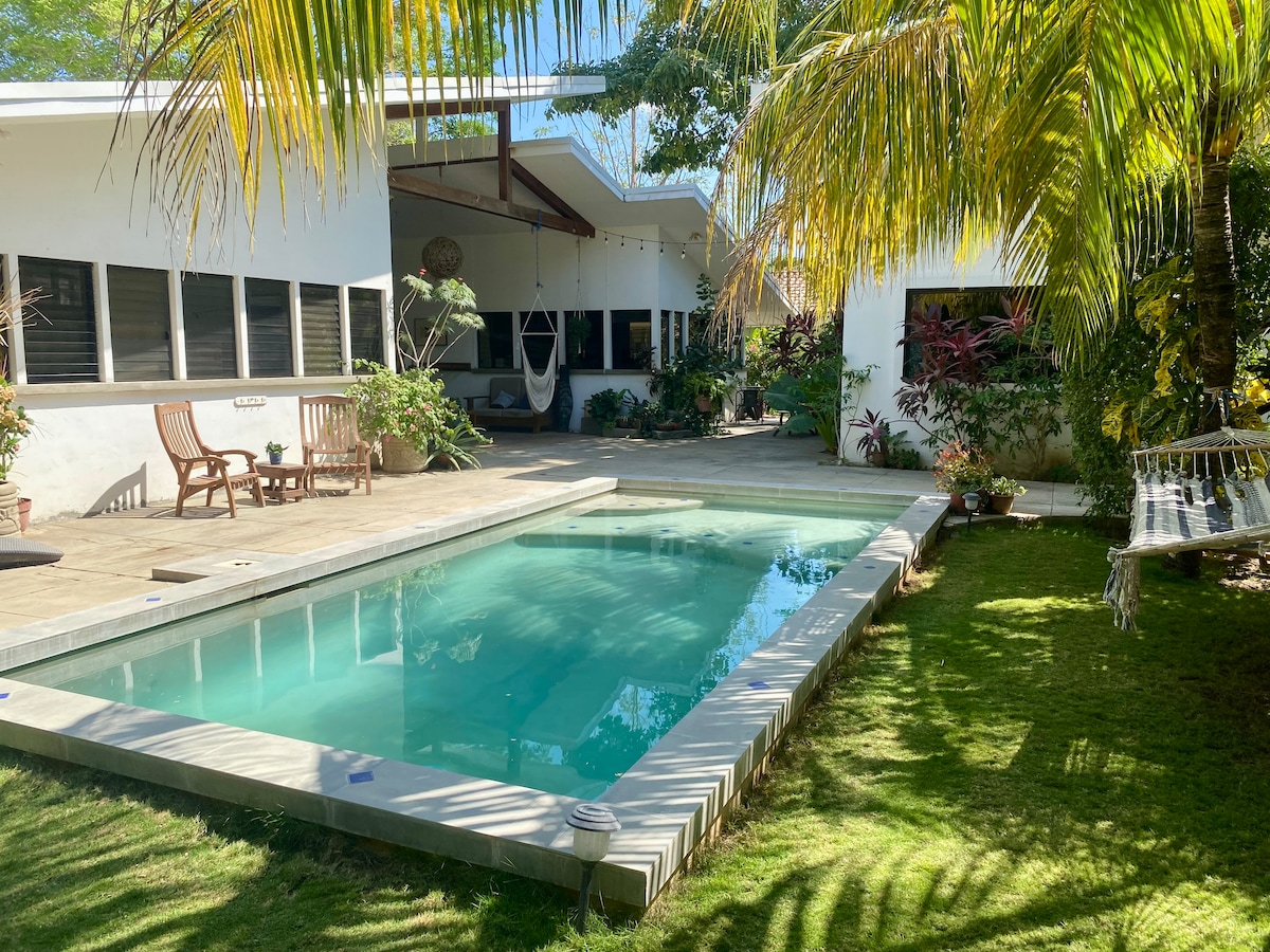 乾淨明亮的房源,位於聖胡安德蘇爾( San Juan Del Sur ) ,坐落在茂密的熱帶樹木中。步行5分鐘即可抵達海灘,步行10-15分鐘即可抵達海灘沿岸的城鎮。 靠近行動,但足以安靜睡覺。房源是一個綠洲,探索一天後,您可以在露臺上享用一杯葡萄酒,在泳池中遊泳,在露天露臺上用餐,在吊牀上放鬆身心,或看電影。