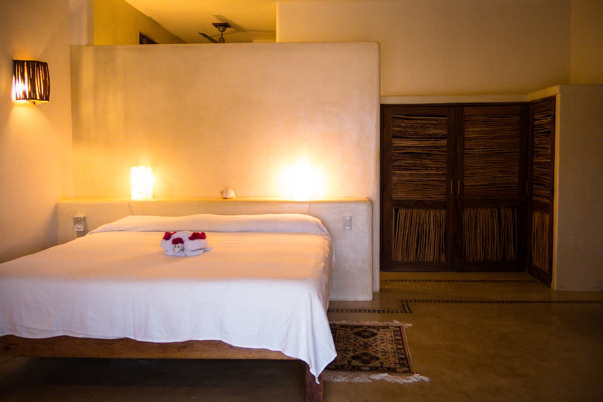 Enjoy a stylish experience at this centrally-located place in Troncones. Brand new build with a kitchenette, a queen bed, and an individual sofa bed. Large rooftop terrace shared with only one more unit. A short walk to the beach and many local restaurants. Enjoy our salt water pool with pool toys for kids of all ages!