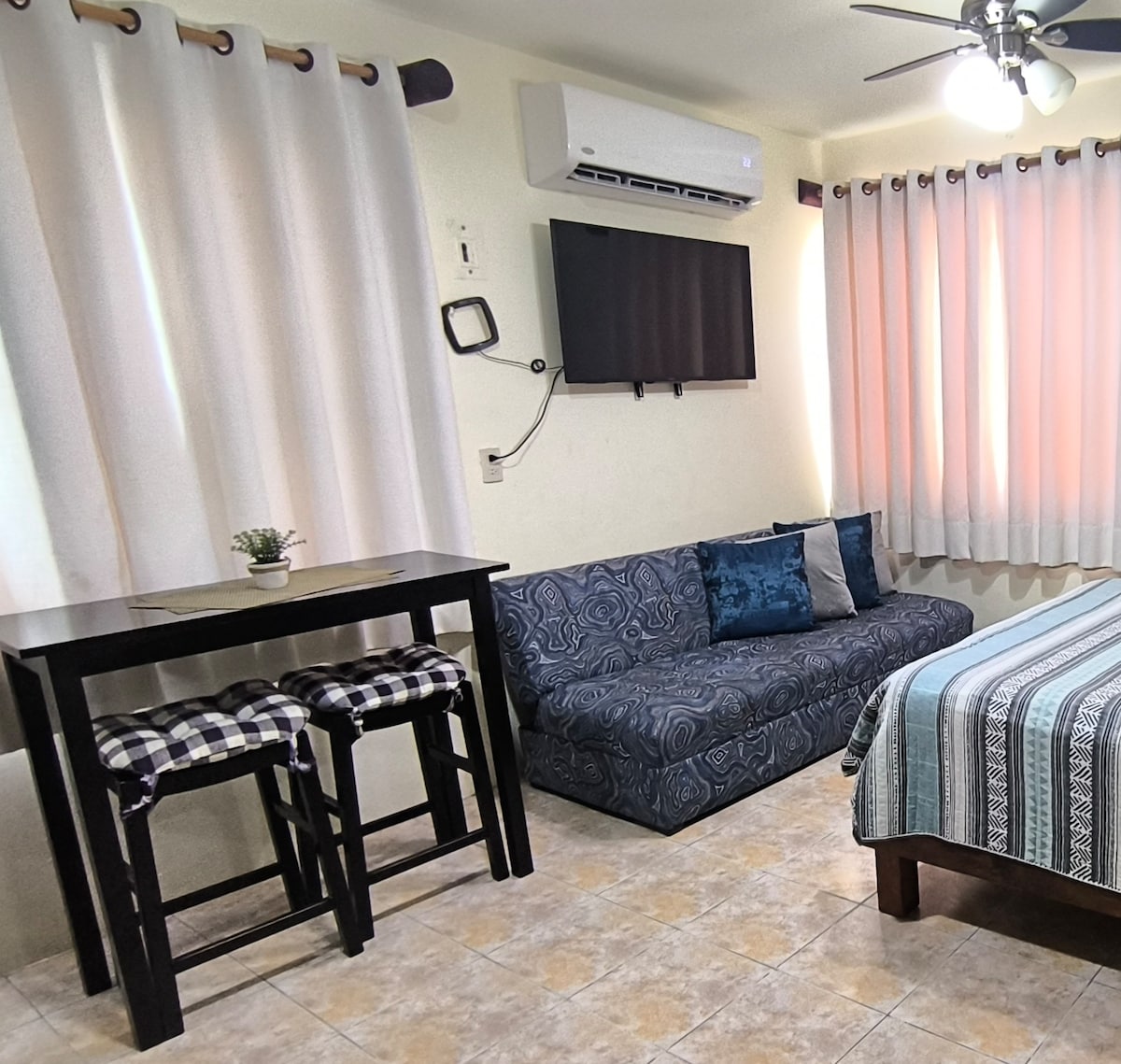 Cómodo mini departamento, con una habitación muy amplia y todo lo necesario para una estancia agradable y placentera, cuenta con una cama matrimonial, un sofá cama, cocina equipada, un baño amplio, aire acondicionado, smart tv con netflix, Internet y una excelente ubicación, muy cercana a las partes más visitadas de nuestra ciudad.