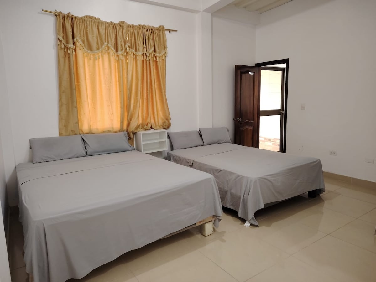 一樓房間,配有雙人床和兩張1.5床的雙層床,最多可容納6人,非常適合團體或家庭入住。 配有空調、功能齊全的獨立衛浴、可收看Netflix的智慧電視、衣櫃式衣架和衣架。 舒適且通風良好。 可免費使用泳池、廚房、烤架、花園、吊床等。 距離海灘和蒙塔尼塔市中心僅7分鐘路程,但遠離噪音。 寧靜的空間,適合與親友共享。