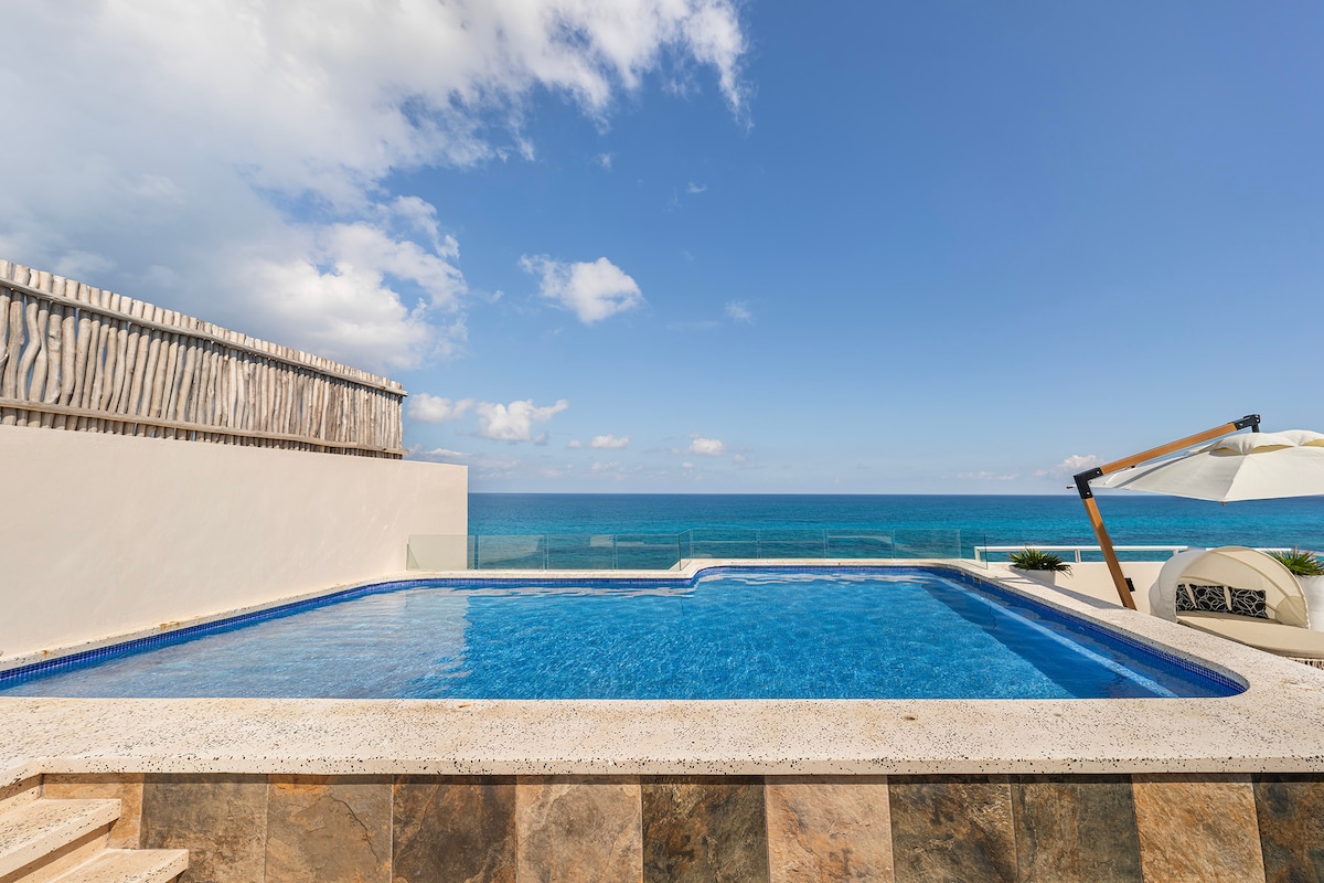 雙臥室別墅,可欣賞迷人的海景(可睡6人) 屋頂泳池可360度欣賞島嶼和坎昆的美景。 客廳和主套房可俯瞰迷人的加勒比海。 位於穆赫雷斯島( Isla Mujeres )的中心,您可以在這裡享受寧靜、舒適的海風和無與倫比的海景。 距離許多很棒的餐廳、市中心和北海灘不遠。 按摩浴缸可欣賞海景,浴缸四周環繞著手工切割的Tikul瓷磚。