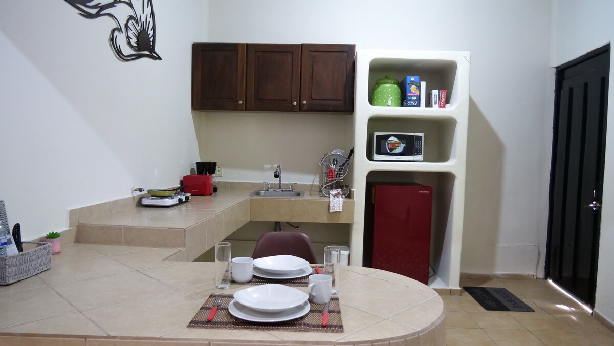 Estudio: 350m de la playa, AC,baño, wifi, cocineta