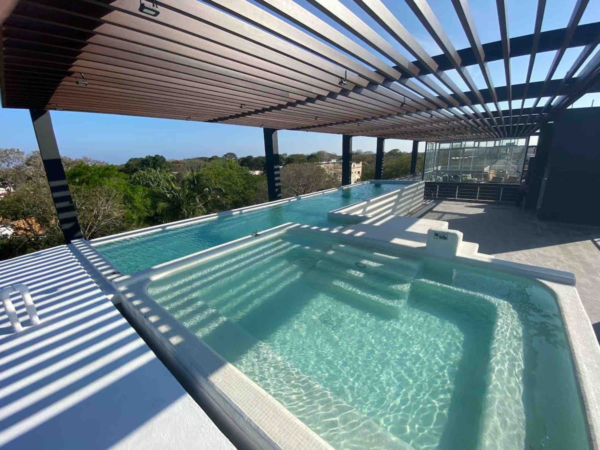 豪華1間臥室套房,提供獨特位置的隱私,旨在讓您感受天堂。地理位置無與倫比,距離海灘僅150公尺,步行2分鐘即可抵達第五大道,您可以在那裡找到餐廳、酒吧和商店。您還可以欣賞普拉亞德爾卡曼最佳的屋頂景觀,以及禮賓和24小時保安服務。