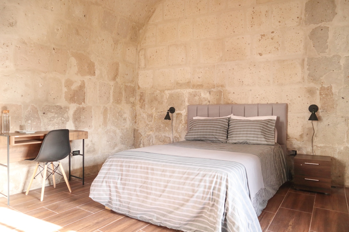 Habitación del siglo XVIII, construida en su totalidad de Sillar, piedra volcánica característica de las construcciones coloniales en Arequipa. Fue restaurada y renovada combinando a la perfección un estilo minimalista con la arquitectura caracteristica de esa epoca.