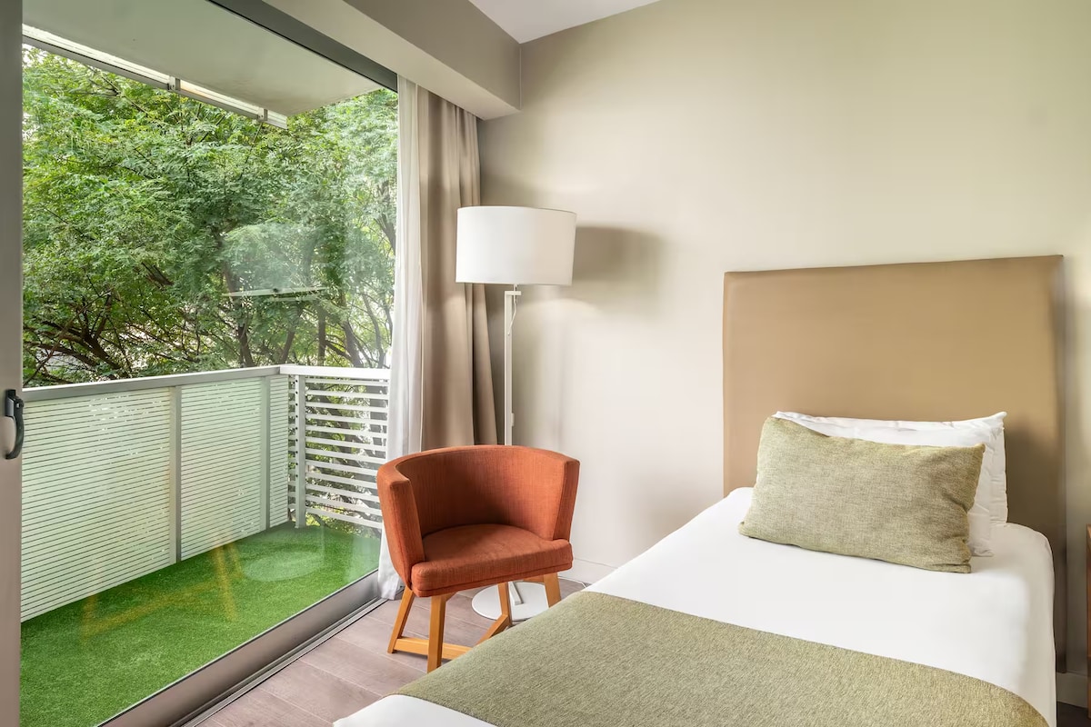 Hospédate a solo pasos del Congreso y de la Av. Corrientes, rodeado de teatros, cafés y vida nocturna. Disfrutá de habitaciones modernas con aire acondicionado, TV, minibar y un espacio de estar minimalista. Podes elegir camas twin o matrimonial. Relajate en nuestra terraza con vistas panorámicas o entrena en el gimnasio. A 10 min de Puerto Madero y a 7 km del Aeroparque Jorge Newbery. Ideal para quienes buscan comodidad, diseño y una ubicación estratégica para explorar Buenos Aires.