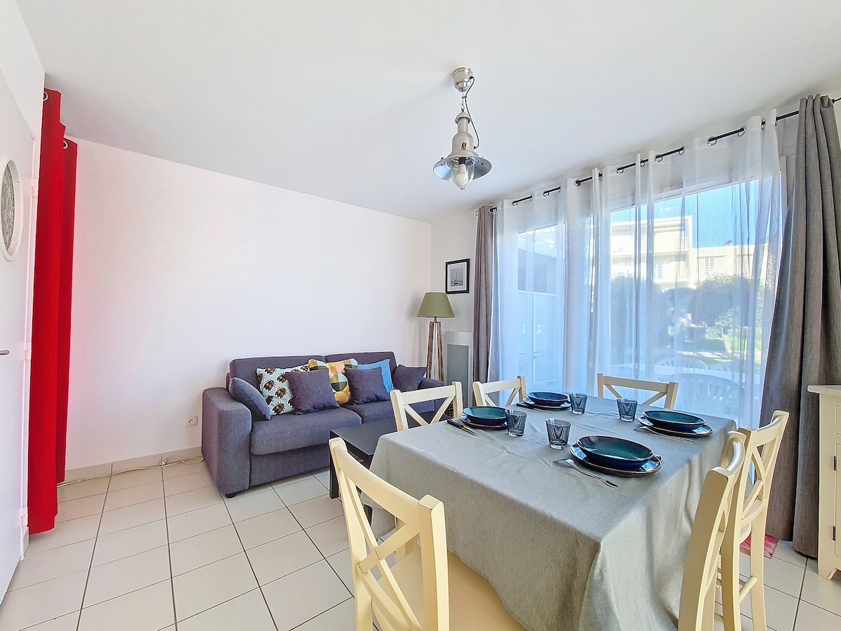 30 平方公尺的住宿,地理位置優越,可輕鬆前往所有景點和便利設施,步行即可抵達。旅遊局、航海中心、麵包店、理髮店、電影院、游泳池、煙草店、餐廳、護理室。 包括一間主臥室,配有沙發、小廚房、2 灶電磁爐、小冰箱、咖啡機(過濾器)、 水壺、微波爐和廚房用具。 一間浴室,配有淋浴間、毛巾烘乾機、吹風機。