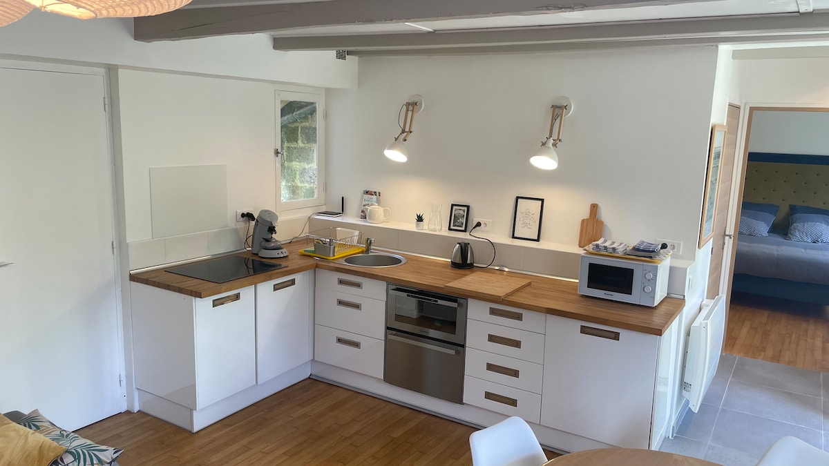 Profitez d un studio dans un joli village avec toutes les commodités à pieds.Vous avez une grande cour pour garer votre véhicule fermé avec portail électrique.Vous avez une entrée privée pour l accès au studio.Un coin terrasse et accès au jardin avec salon jardin.Vous êtes à 4 kms de la belle ville de Quimper et à 12kms des belles plages Île Tudy,Combrit,Benodet,vous avez accès a la pointe de la Torche,Pointe Du Raz,Audierne,…