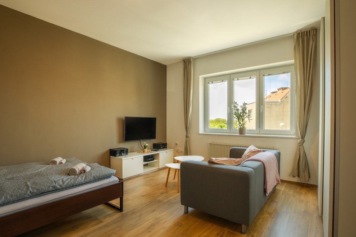 新建的,舒適,寬敞且設備齊全的公寓(可容納4人),位於市中心,距離皮爾森廣場僅702米,有自己的停車位。與家人或朋友一起,您將距離所有有趣的地方(啤酒廠、舒適的咖啡館和餐廳、歷史中心、足球場、動物園等)都很近。24小時都可以入住。您可以在舒適的沙發上喝咖啡和看電視,在設備齊全的廚房烹飪,在50米外的Kaufland購物或跳到對面的麥當勞...