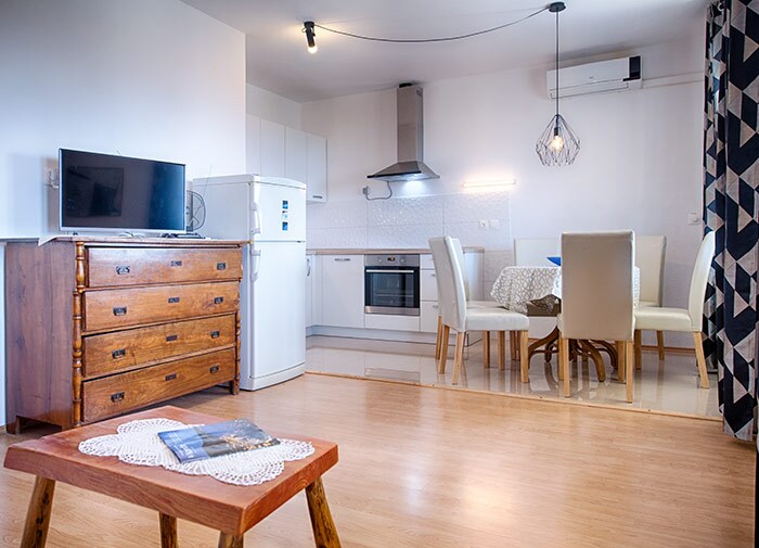 Apartment is situated on the first floor of family house with beautiful view to the sea and harbour. It is consists of two bedrooms, one is master bedroom another one has master bed and bed for one person. The kitchen with living room, is equipped with an oven, cooker, fridge and freezer, dishwasher and small household appliances and dishes, couch, TV. The apartment has a covered terrace with a view of the sea. Two bathrooms. It has air conditioning, internet wi-fi, TV.