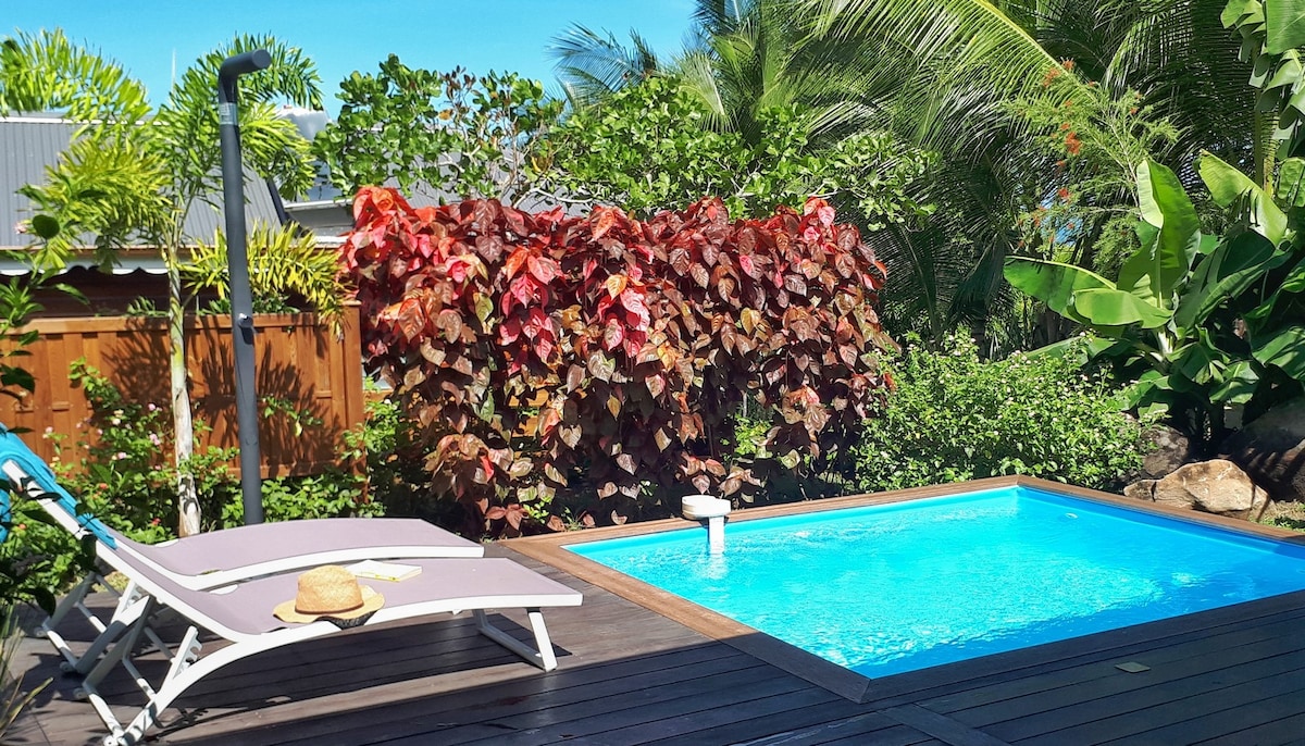 這間迷人的私人小屋位於聖安妮(Ste Anne)高地,距離商店、Club Med 天堂海灘、博瓦約蘭(Bois Jolan)和村莊僅 5 分鐘(開車 3 3 公里)車程。 這座 3000 平方公尺的房產坐落於山頂,環境優美,自然通風。 這間小屋非常適合自然愛好者,它坐落在一片綠地中,提供私人泳池,讓您在入住期間享受寧靜、安寧和私密的環境,放鬆身心。