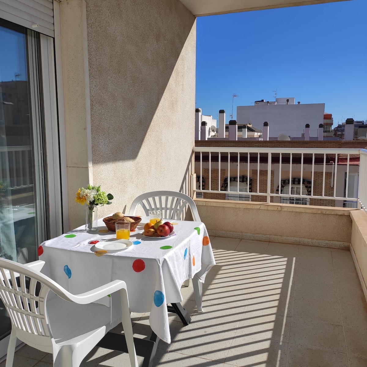 舒適明亮的公寓,配有泳池,距離海灘250公尺的停車位。 設備齊全,有2間房間,有大露臺、社區泳池和停車位。 地理位置非常好,無需開車即可前往市中心或海灘。 非常靠近商場, Mercadona。 公寓的住宅區非常安靜,靠近一切。 距離機場15公裏,車程約15分鐘。 非常適合情侶、商務差旅、有小孩的家庭和小團體