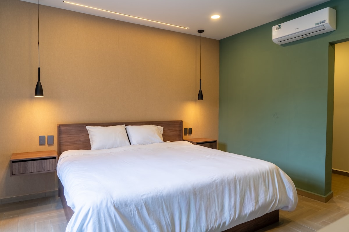我們的套房有一張加大雙人牀、設備齊全的小廚房、電視房(智慧電視)、獨立浴室、設計師家具、高速網路、空調,位於Paseo de la Reforma、Zona Rosa和Roma和Condesa殖民地之間的絕佳位置,是市內最具活力的生活的中心,擁有所有溝通渠道、地鐵、Metrobus、Turibus、計程車。