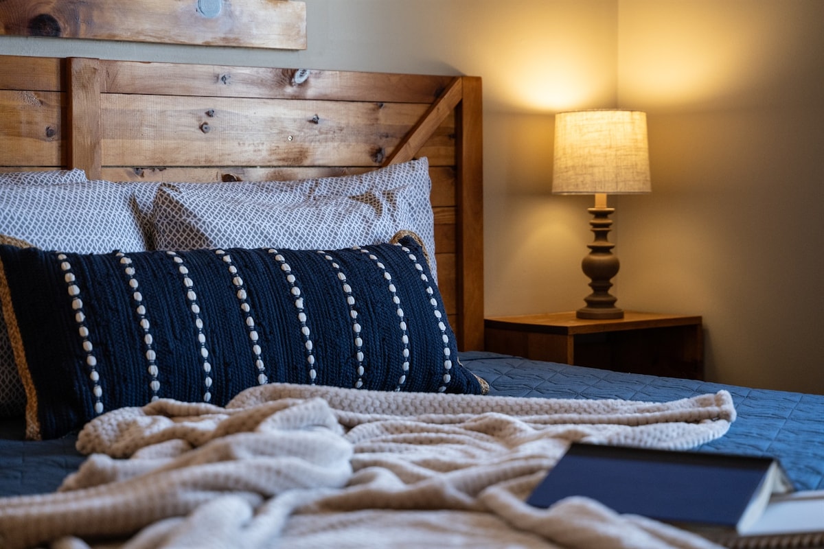 Your private family lake escape! Fully updated, tranquil and relaxing, yet modern. Relax and enjoy the lake from the deck or picnic areas. Cast a line from the dock or hop in the provided kayaks or mini pontoon! Enjoy a warm bath in the new jacuzzi tub & breathtaking double-shower, then cozy up to a movie in front of the electric fireplaces! BBQ grill & flat top included. Large loft w/ 2 queen beds & master bedroom w/ king. Perfect for priceless family memories on the lake. Fiber internet, too!