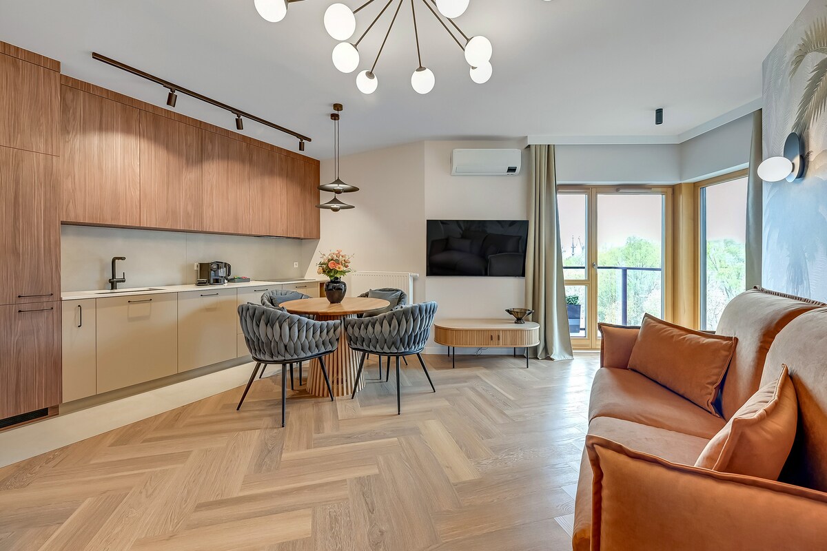 獨立浴缸、陽臺和時尚的室內裝潢—非常適合情侶或有孩子的家庭入住! 此公寓配有一間臥室和一張沙發床,最多可供 4 位房客舒適入住。 現場設施包括健身房、桑拿房、屋頂露臺和遊樂場。 位於格但斯克舊城區和莫特瓦河附近,非常適合浪漫度假或家庭入住。