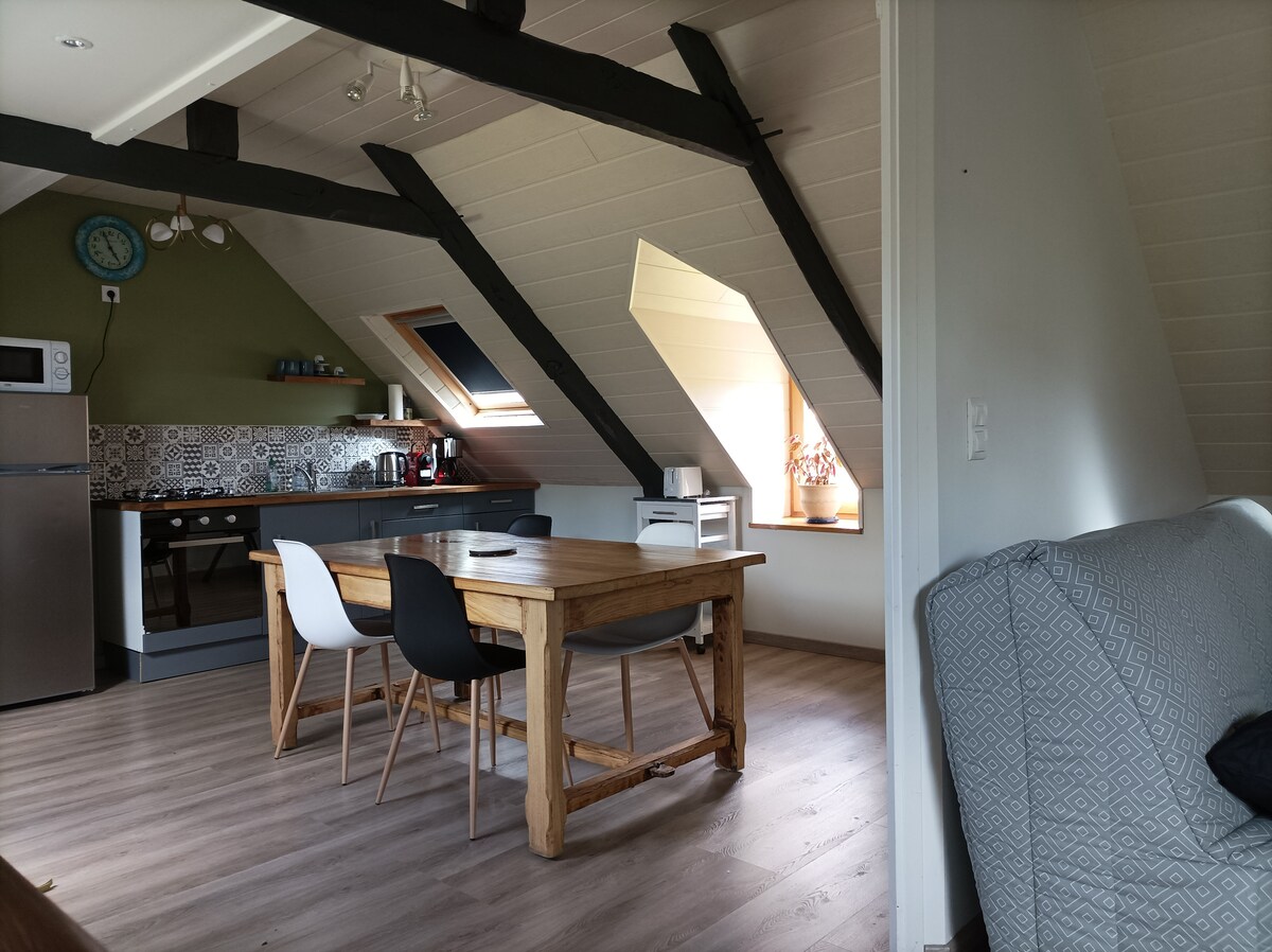 歡迎來到La Villeneuve。 我們位於鄉村的農舍一樓歡迎您,周圍環繞著樹林和田野。 這間公寓於2019年全面翻修,同時保持房屋的特色。 距離雷德內市中心5分鐘路程,在那裡您可以找到所有當地商店,開車10分鐘即可抵達海灘。 Ar Grinol將讓您在探索我們美麗的地區後休息。