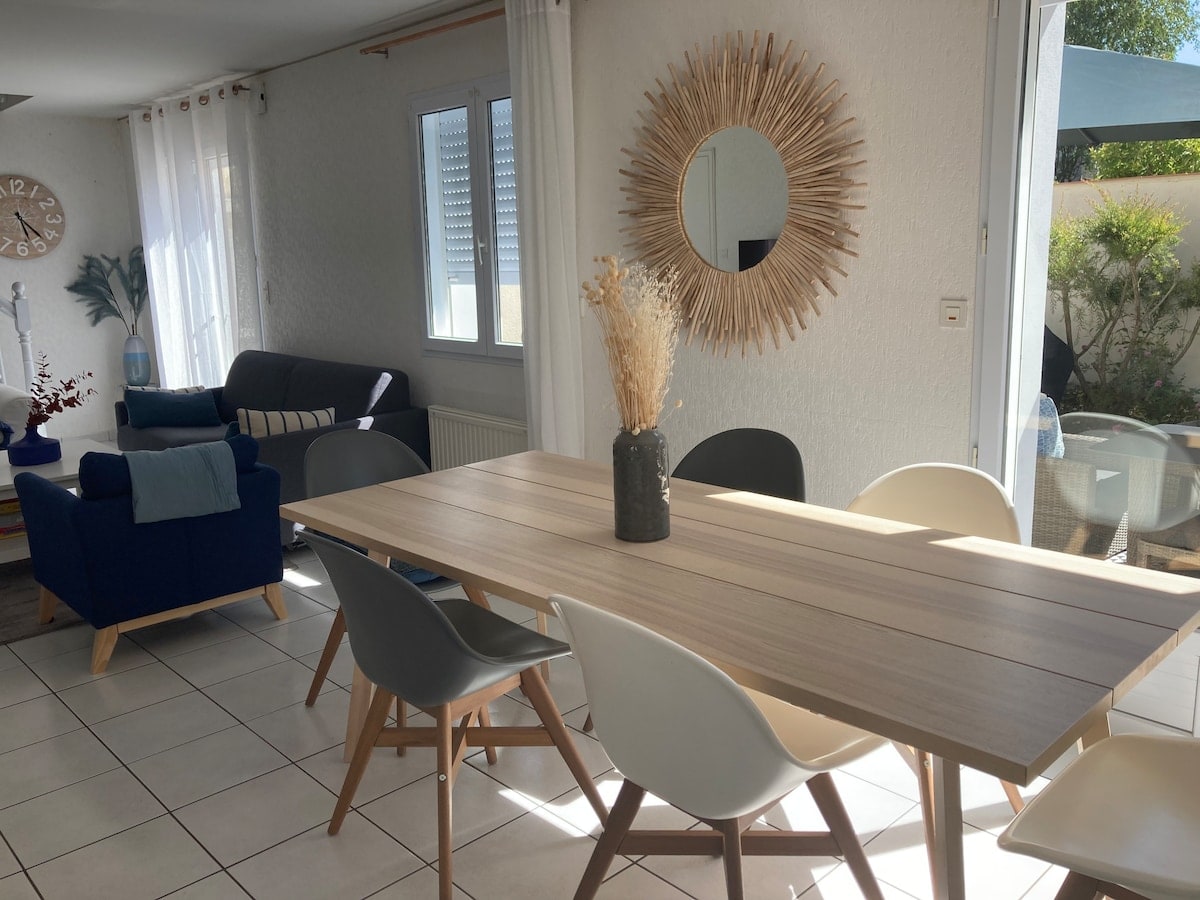 Maison familiale de 95 m2 dans quartier très calme même l'été, à 500m du centre, du vieux port , de la gare, des plages et commerces et thalasso à 800m 3 chambres avec 2 Sdb avec équipement bébé, grande cuisinée équipée avec salon et séjour ouvert sur terrasse plein sud, plancha, salon de jardin Jusqu'à 8 personnes max. Parking dans la cour sécurisée de la maison pour 2 voitures Wifi très haut débit (fibre) Non fumeurs, les animaux non acceptés sauf exception sur demande