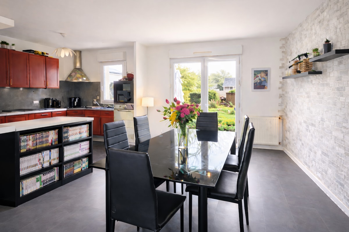 度假的理想房子,距離大海10公里。 - 1 座花園景觀露臺,設有戶外座位 - 2 間臥室,配有電視(160 公分雙人床) - 1間浴室,配備淋浴間 1間廁所 - 1間廚房,開放式飯廳和客廳,配有沙發床和電視 - 2 個停車位、密碼鎖盒(燒烤與新瓶、WiFi、洗衣機、烘乾機、微波爐、空氣炸鍋、咖啡機、水壺、洗碗機、冰箱、冷凍庫和嬰兒床 也適用於商務