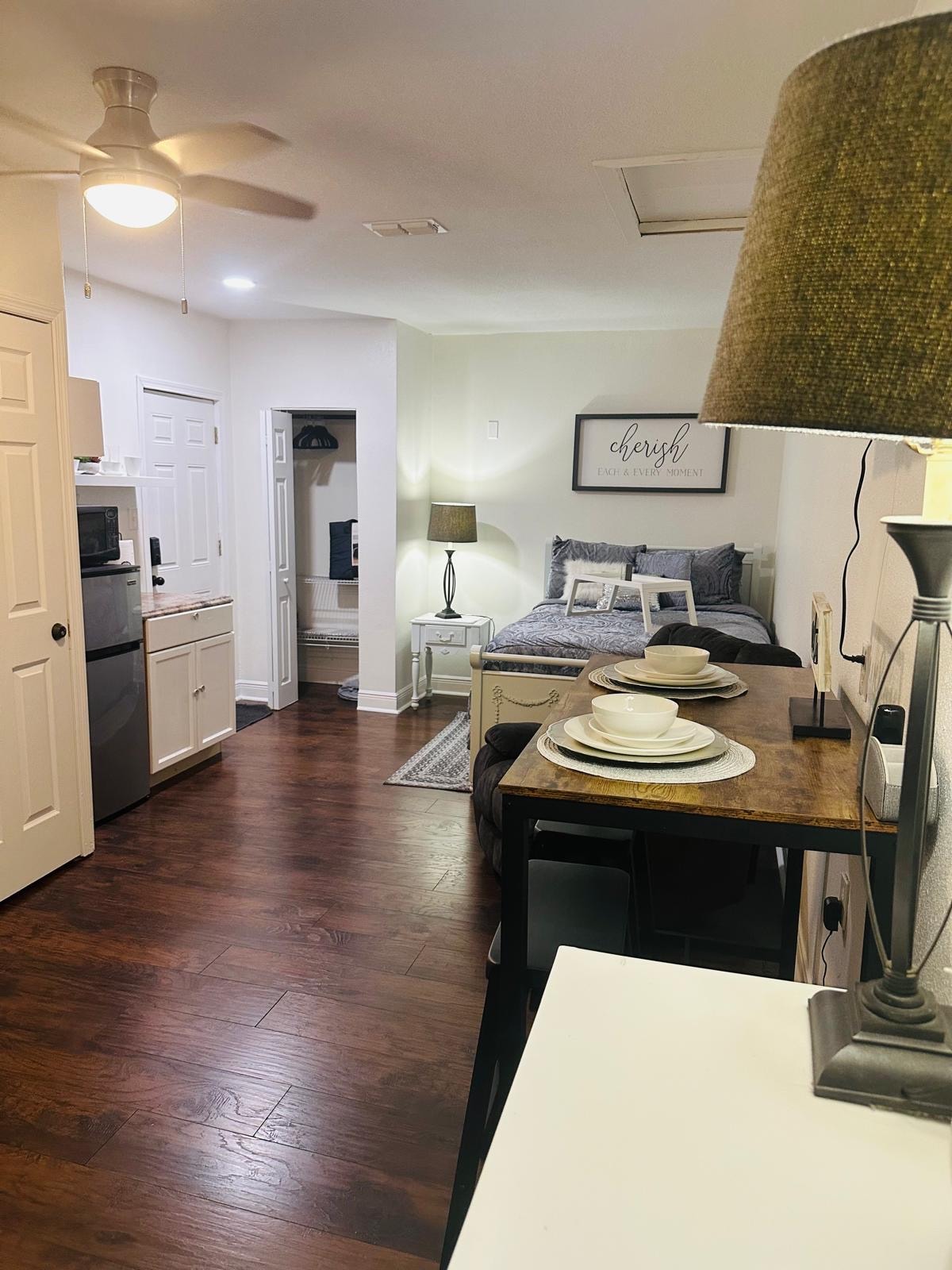 沒有共用區域。此公寓位於獨立區域,有獨立入口。 它有1間配有標準雙人牀的臥室、55英寸智慧電視、梳妝臺、衣櫃和2個牀頭櫃。 書房內有50英寸智慧電視、水槽、微波爐、桌子和2張椅子、爐臺、小冰箱/冷凍庫、「L」形沙發。 浴室配有雙盥洗盆、淋浴間、浴缸、牀單衣櫃和沐浴露分配器。 提供WiFi、Netflix、Amazon Prime、HBO Max。 提供1.8米寬的充氣牀。私人後院