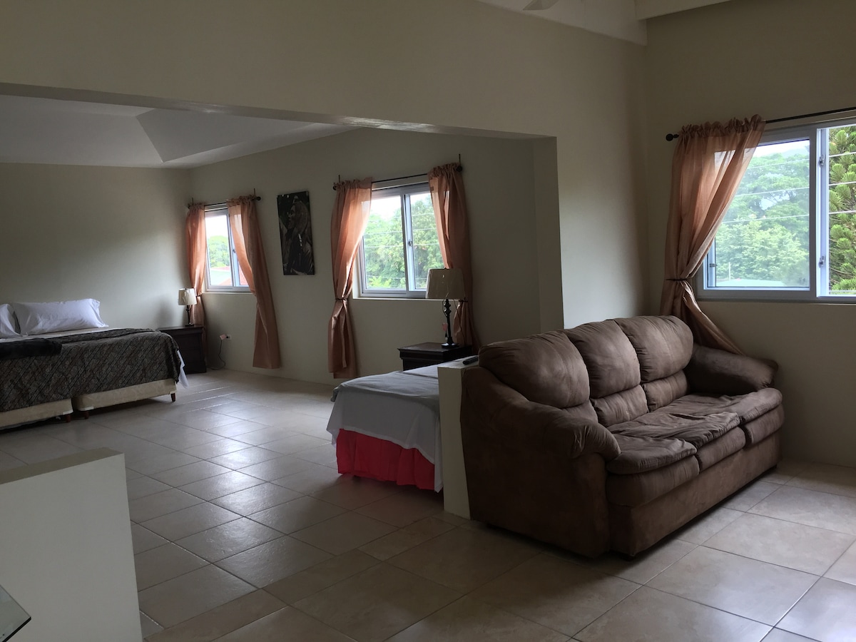 This private room is spacious and comfortable , a great place to relax and enjoy the sunset from the balcony . It's easily adjustable to your comfort . This home has a king size bed a single bed and sofa bed . Walk in rainforest shower , air conditioner , our place is great for group traveller , assistance 24 hrs . We are always around to offer as mush help as possible . We are also central to the Constant Spring , Oliver and manor park area .