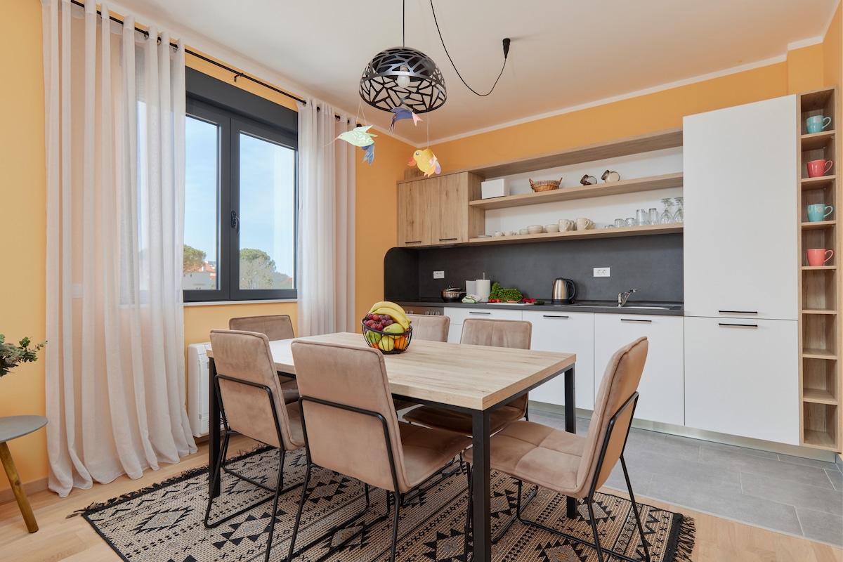 歡迎來到我們的現代情侶公寓,配有露天熱水浴缸和迷人的海景和城市景觀。 Misisuone公寓位於一個安靜社區的地中海別墅中,距離最近的Slovenska海灘只有一公裏,距離幾家好的餐廳、雜貨店和商店只有300米。 我們提供乾淨舒適的公寓,提供免費私人泊車設施和WiFi。我們的職員的待客之道將讓您在我們的裝潢精良、設備精良的公寓住宿愉快。