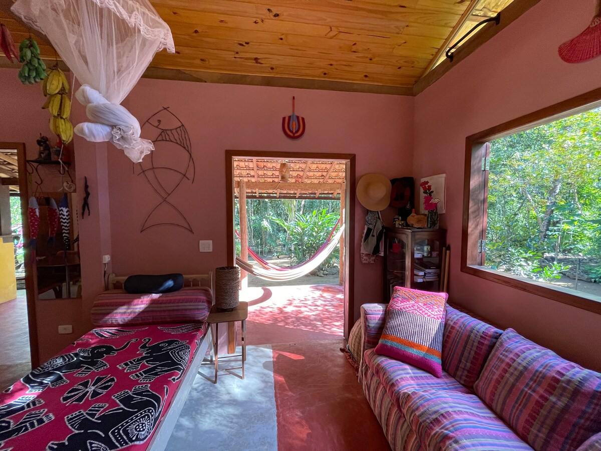 The Monkey House is gently immersed among the trees, just a few minutes from natural swimming pools and waterfalls. It offers safe, comfortable, and fully equipped indoor spaces, high speed internet, as well as an open rooftop terrace designed as a lounge observatory overlooking the surrounding exuberant nature. The house is part of the Aldeia Rizoma retreat center, with access to a sauna, massage area, jungle gym, nature trails, agroforestry areas, gastronomy and natural spring water.