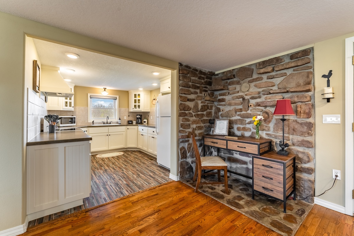 Renovated Dairy Barn offers country views, yet comfort. Open concept living, high ceilings, large windows framing up scenery. Kitchen equipped with top end appliances, quartz counters; & ability for cooked meals. Great bathroom finishes with bright atmosphere. Private Patio, views of rolling hills & valleys. 1 Queen bed, 1 Pull Out. Use for getaways, vacations, or escaping city life. Smart TV with paid Apps, Wifi. Minutes from Pea Ridge, Ar, 20 mins to Bentonville, and close to Brewery.