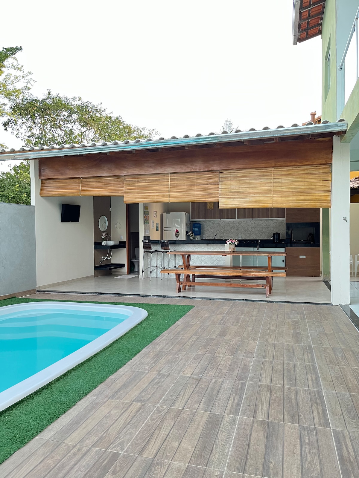 3 quartos, ou seja: 1 suíte + 2 quartos, todos com camas queen, todos com ar condicionado. Banheiro social e lavabo. Cozinha equipada comgeladeira, freezer , microondas, coifa, Cooktop, forno elétrico, air fryer, liquidificador, misteira, taças, louças. Sala de jantar e TV integradas. Piscina c/ cascata em pedras naturais; chuveirão; churrasqueira. A 150m do mar. Cobramos R$50,00 por dia de taxa de energia. Roupas de cama. Serviço de cozinheira/arrumadeira (sempre consultar disponibilidade).