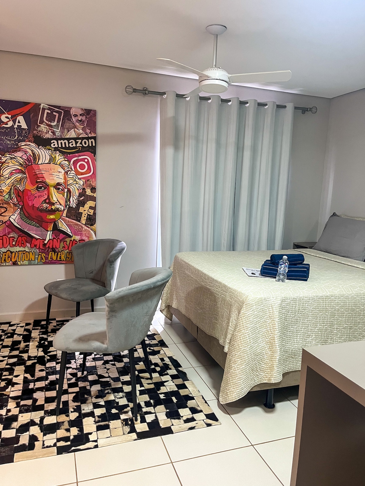 Studio moderno e aconchegante, localizado na Zona Sul de Ribeirão Preto. Totalmente decorado e bem planejado, com cama Queen (macia), ar condicionado, ventilador de teto, cortina blackout, Wi-fi e TV Smart com vários Streamings liberados para vocês! Para os amantes de séries, possuímos Netflix, Disney+, Star+ e MAX, todos liberados para uma boa maratona.