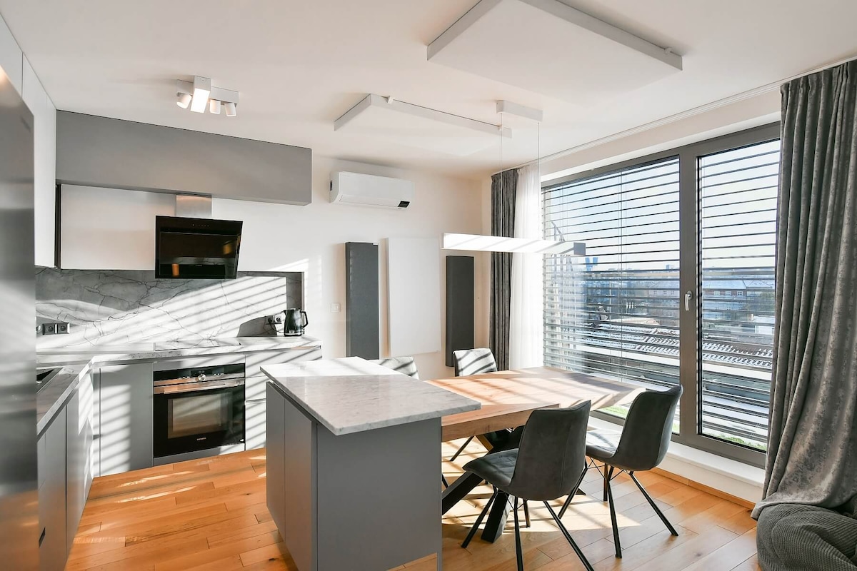 全新豪華65平方公尺公寓,6樓有陽臺(2025)。 乘坐電車17分鐘或乘坐計程車8分鐘(6–8歐元)即可抵達市中心。 2.8公尺高天花板、義大利Concreta廚房、博世電器、定制家具、加大雙人床、沙發床(最多可供4位房客使用)。 65英寸智慧電視、Netflix、Wi-Fi、新鮮空氣系統、實木地板。 安全的建築物,配有芯片門禁、24小時攝影機、地下停車場。 公園、超市和電車站就在隔壁。