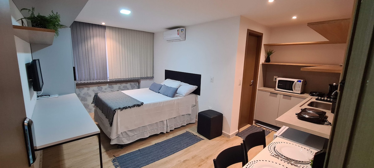 Flat único para relaxar, possui todo conforto e segurança que você procura. Equipamentos: -Cooktop de indução, Airfryer, Microondas, purificador de agua gelada e natural, cafeteira elétrica -Geladeira, Sanduicheira, Panelas, Copos, Pratos, Talheres, Xícaras -TV com fire stick, Ar condicionado, 01 Cama casal, 01 cama solteiro, 02 colchões de solteiro, ventilador, rede na varanda, chuveiro quente. -Wi-fi -Mesa na varanda e na cozinha -Lençóis, Tolhas e Travesseiro