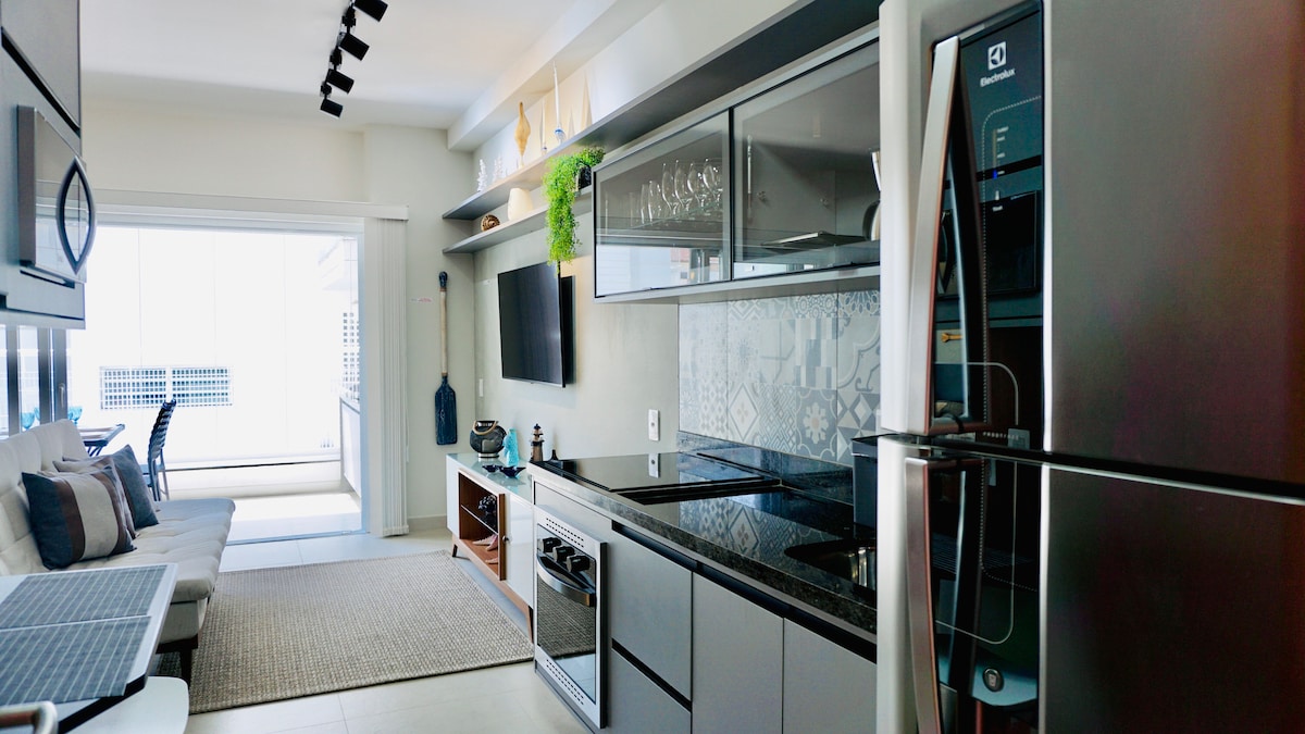 40 平方公尺的單間公寓,現代而舒適,配有全套廚房和主要家電、Wi-Fi、空調、智慧電視、可俯瞰泳池的寬敞陽臺,一切都為您的舒適和安寧而設。 Residencial Fiji 是一個全新的現代化公寓,坐落在大海灘最迷人的區域,距離海灘僅幾步之遙。設有全套休閒區,包括桑拿房、健身房、遊戲室、遊樂場、自助洗衣房和製冰機。