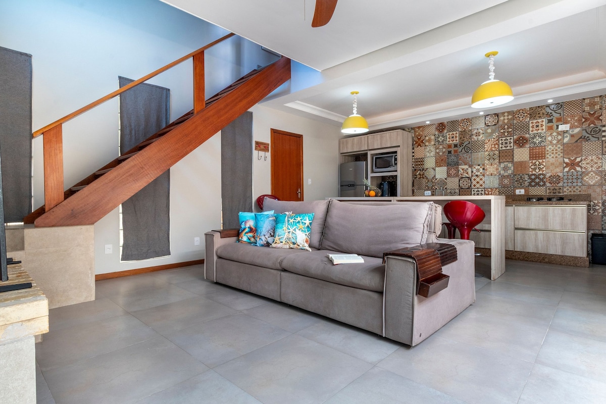 Amplo loft com estilo único e aconchegante, mistura de industrial e minimalista, com detalhes em madeira na estrutura e decoração. 2 quartos 1 com cama Qeen e Ar condicionado de 24.000 BTUs. 1 quarto com cama de solteiro. Espaço exclusivo para trabalho Home Office. Pátio privativo com tanquinho e varal de parede. Esta localizada a 400 metros da praia, em um dos pontos mais calmos de Canasvieiras, mesmo que em alta temporada. Esperamos vocês para compartilhar a beleza deste pequeno paraíso!