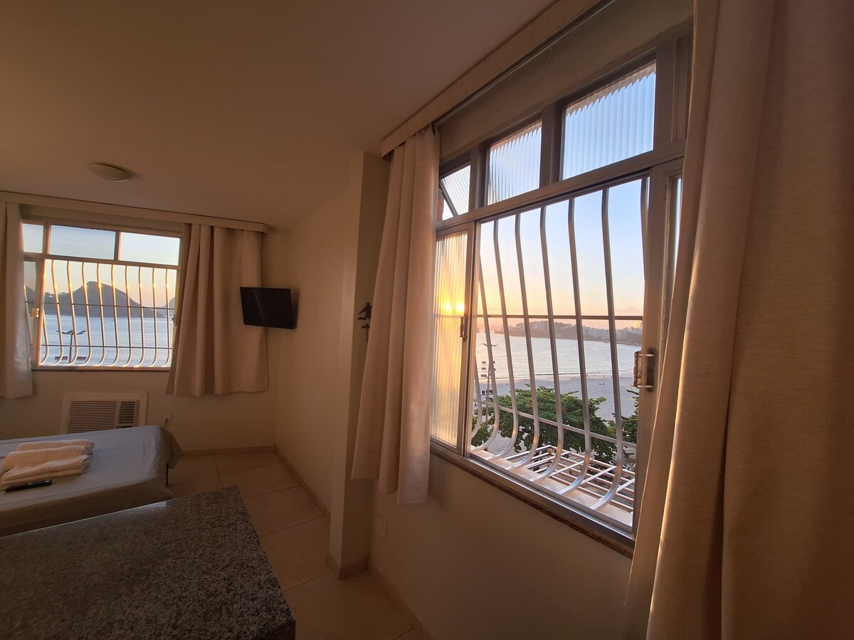 大樓位於Icaraí海灘前面,開車或乘坐巴士前往都很方便,距離市中心15分鐘,距離裏約熱內盧35分鐘。 附近有麵包店和商店。電視、空調和風扇。全新廚房用具、微波爐、冰箱、爐臺和電咖啡機、水果機和電動淋浴間。