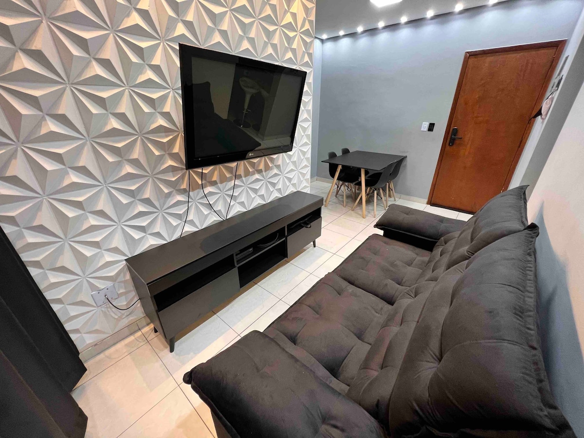 迷人且功能齊全的公寓,距離海灘不到5分鐘。🏖️ - 5樓/距離海灘300公尺 -房間配有天花板風扇、桌子和4把椅子、可伸縮沙發和32英寸電視 - 01 間臥室,配有雙人床、衣櫃、天花板和柱狀風扇以及兩張額外的床墊。 -美食袋,配有電燒烤和安全網。 -廚房配有冰箱、爐具、微波爐、攪拌機、鍋具和餐具。 -包括01個停車位(小型車)。 -提供WiFi。