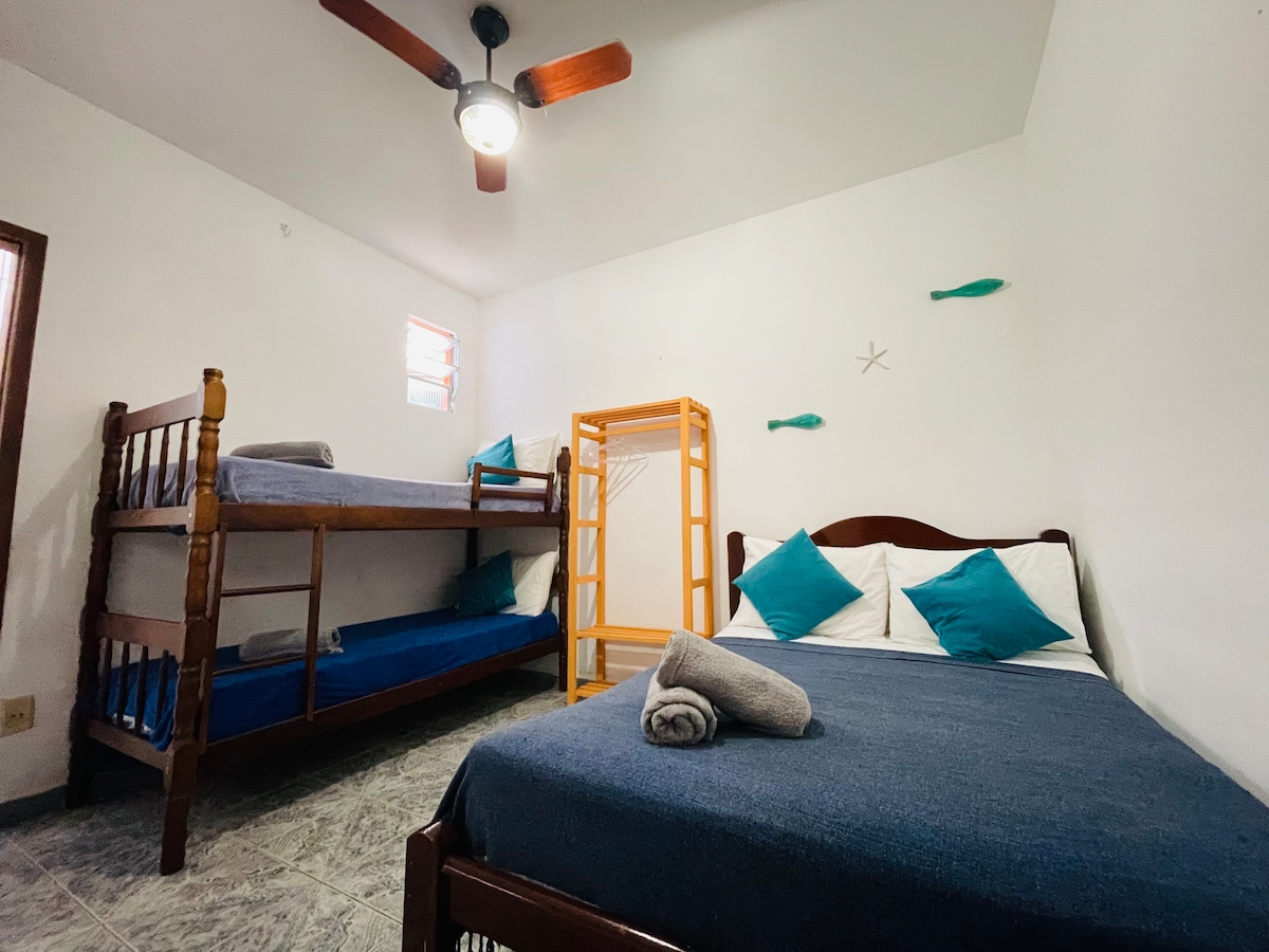 套房位於二樓。套房沒有爐子,但有三明治機、咖啡機、冰箱等...套房有一張雙人床、一張單人床、空調、電視和風扇。 套房位於Getulio Vargas街的盡頭,到達角落的海灘。這個地方非常安靜,熟悉。因此,我們不允許在空間內播放高音量的音樂。 我們接受小型寵物。 淋浴間有熱水。套房是獨立的