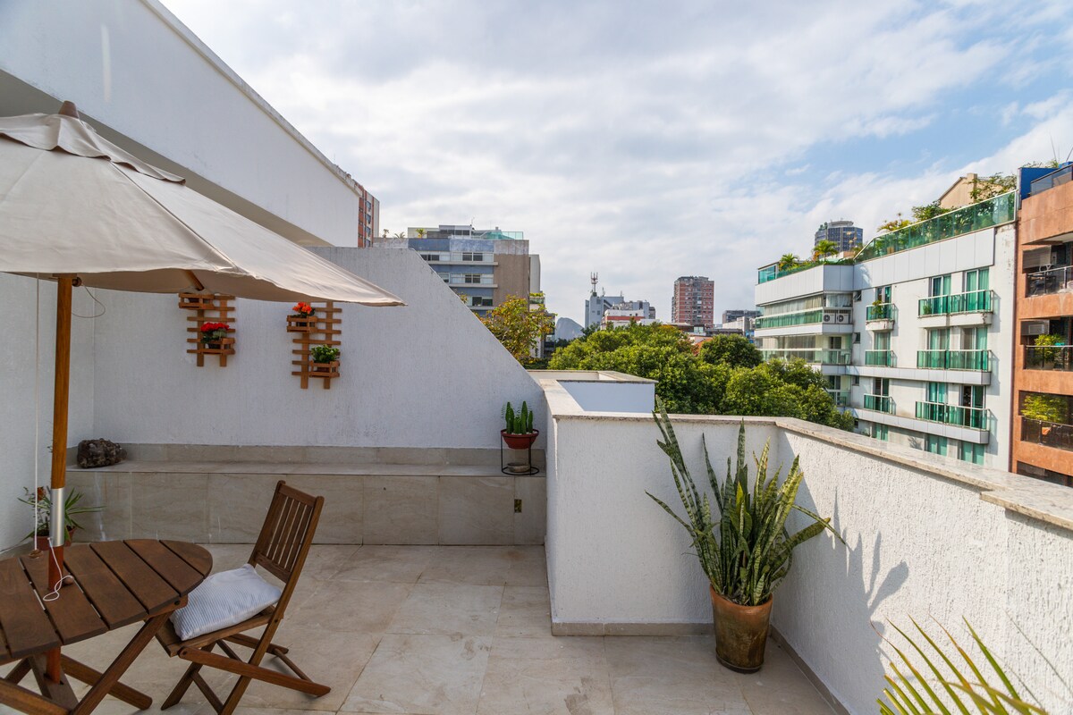 美麗寬敞的屋頂閣樓,距離Leblon最好的美食中心5分鐘路程。 它有一個令人難以置信的美麗陽臺,可欣賞Morro Dois Irmãos的美景。 靠近海灘、RIO設計商場和Leblon商場。 閣樓配有高速WiFi智慧電視、Netflix、空調、洗衣機、設備精良的廚房、雀巢咖啡機和所有設備,讓房客感覺像在家一樣。