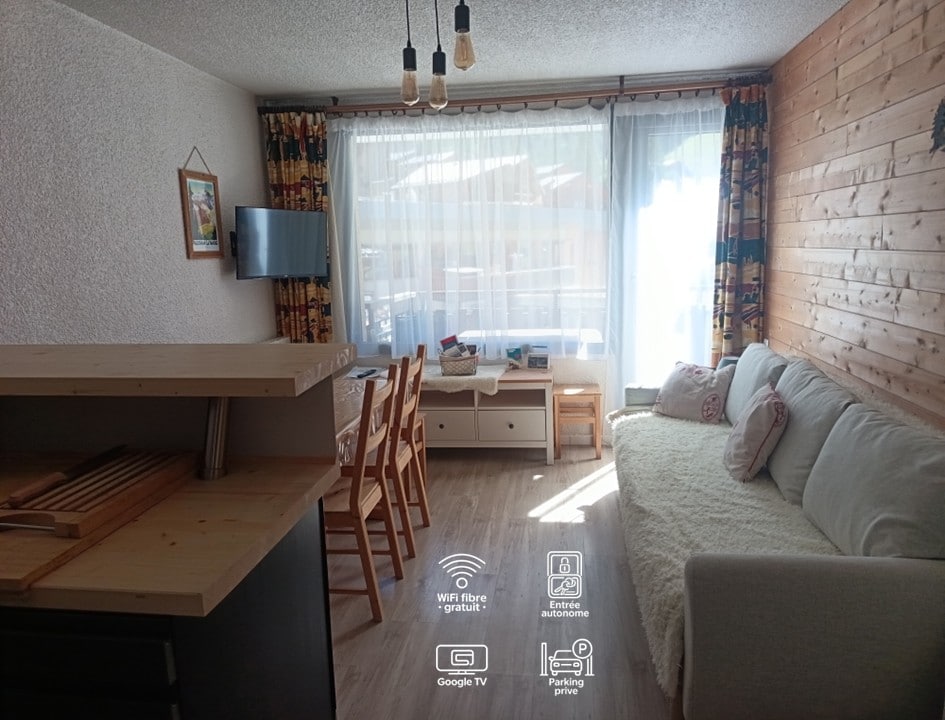 明亮的單間公寓位於Champagny村的典型安靜區域。 商店、酒吧、餐廳,以及前往Champagny/La Plagne/Paradiski的滑雪纜車,步行10分鐘,並可免費接駁。 步行5分鐘即可抵達游泳池、休閒/健康區、遊戲區。 北歐區域和Champagny le Haut toboggan可免費接駁車前往。 面向南方和西南方,可欣賞山景,您可以使用停車位。