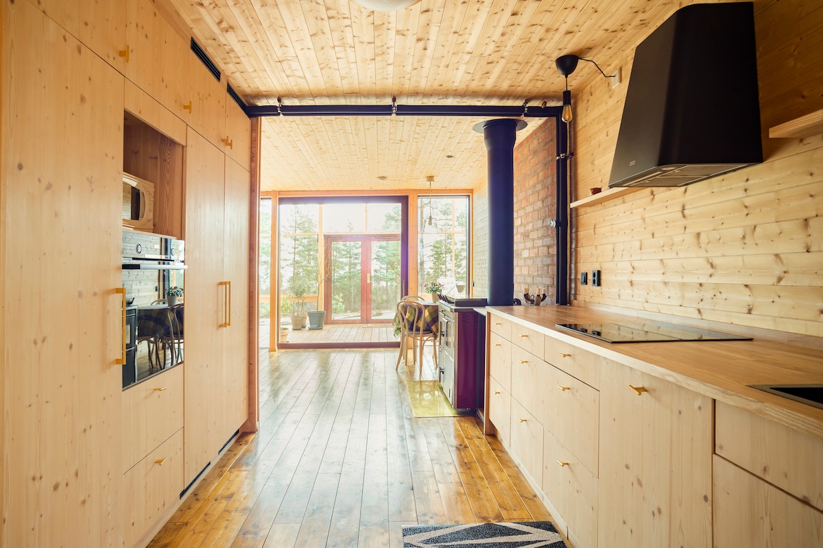 享受時尚的海邊度假,可欣賞海景、使用柴火熱水浴池,並可免費使用海灘、碼頭、獨木舟和桑拿房。 房源裝飾高雅,床鋪舒適,廚房寬敞,客廳有壁爐。 外面有一個大露臺,配有座位和按摩浴缸,非常適合放鬆的夜晚。 有遮蔽的烤肉區 預訂 5-6 位房客時,包含一個獨立的客用住房。 包括床單、毛巾、浴袍、拖鞋和最後清潔。