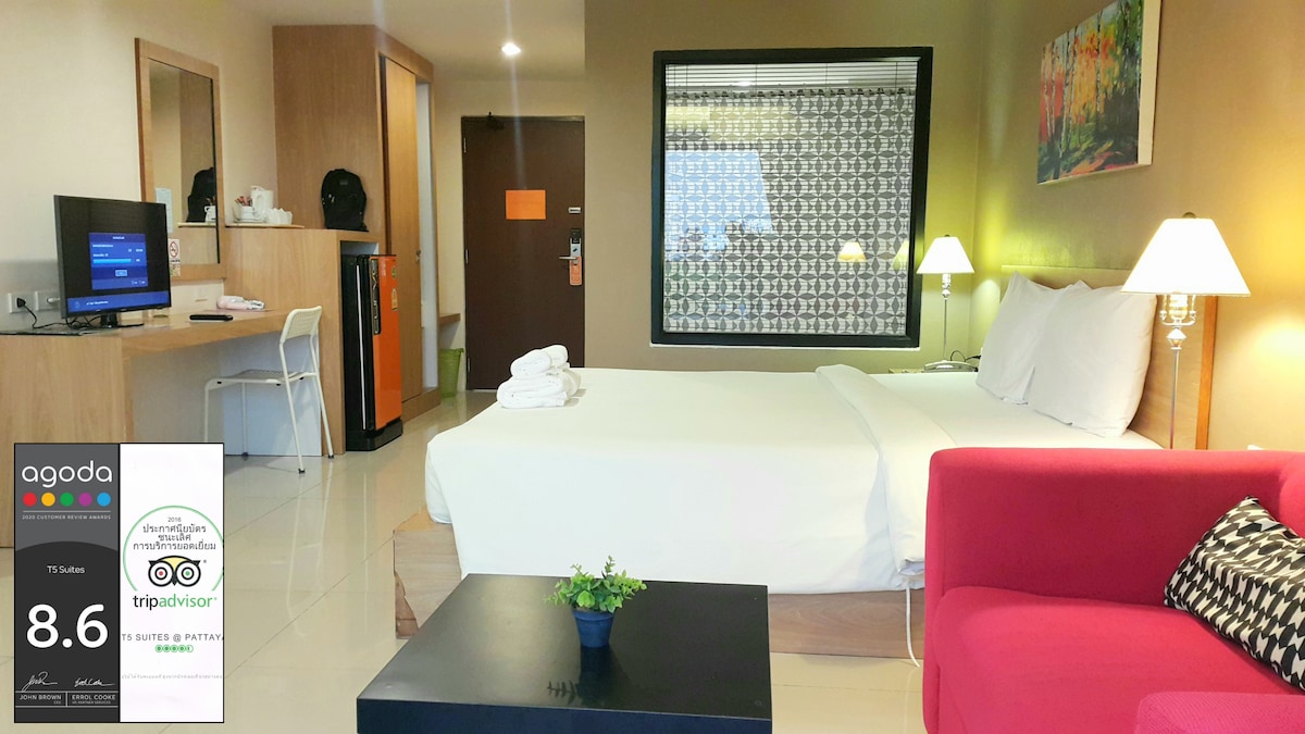 北芭堤雅Arawana Regency的高級加大雙人床房配有免費Wi-Fi、免費盥洗用品、瓶裝水、獨立浴室和免費使用飯店的游泳池。
