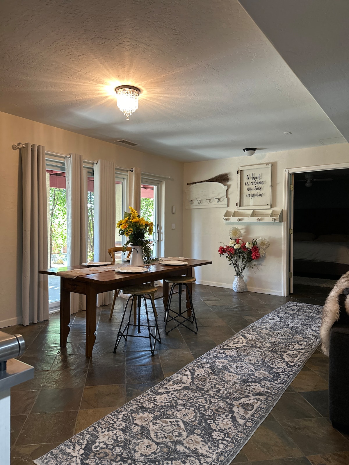 This quaint guest suite provides the coziness of a cottage with all of the amenities that your family needs for an enjoyable getaway in the Yavapai hills. Start your day in a very comfortable king-sized bed and then mozy on over to your kitchenette, fully-stocked with all of the things you need to make coffee or tea and a small meal. The office corner and large patio with a view are the perfect place to work or chill throughout your stay surrounded by the mountains in beautiful Prescott AZ.