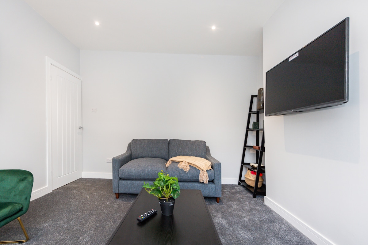 Stylish 2-bedroom ground-floor apartment on a very quiet street in Salford, just a 15-minute drive to Manchester city centre and only a 3-minute walk to the bus stop, Lidl, and local shops. Also only 20 min walk from famous Heaton park.Fully equipped with all essentials, perfect for families with a cot and high chair for toddlers. Bedroom 1 has a king bed, Bedroom 2 a single bed, and the sofa in the lounge converts for a 4th guest. Includes two TVs and a work desk for leisure or business stays.