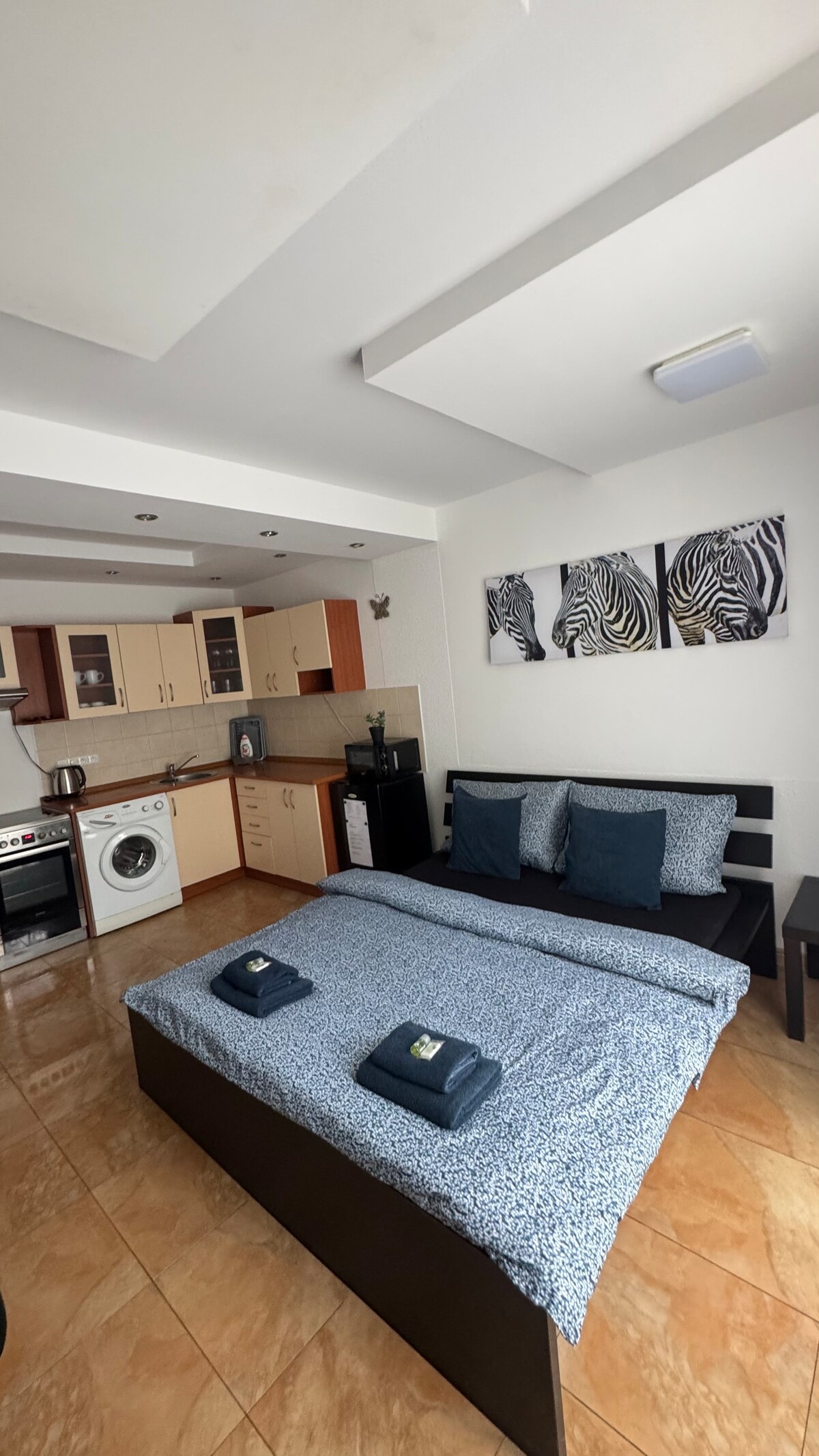 公寓位於房子的一樓。它由一間大房間組成,由pergola分為起居區和睡眠區,以及廚房和浴室與馬桶。 睡眠區有一張大雙人牀,客廳有兩張沙發牀。可供四人使用的幹淨牀上用品。 廚房配備了常見電器-爐竈、水壺、冰箱、烤箱、陶具和刀具。浴室有洗衣機,配備配件、毛巾和公共衛生用品。公寓內的WIFI是當然的問題。