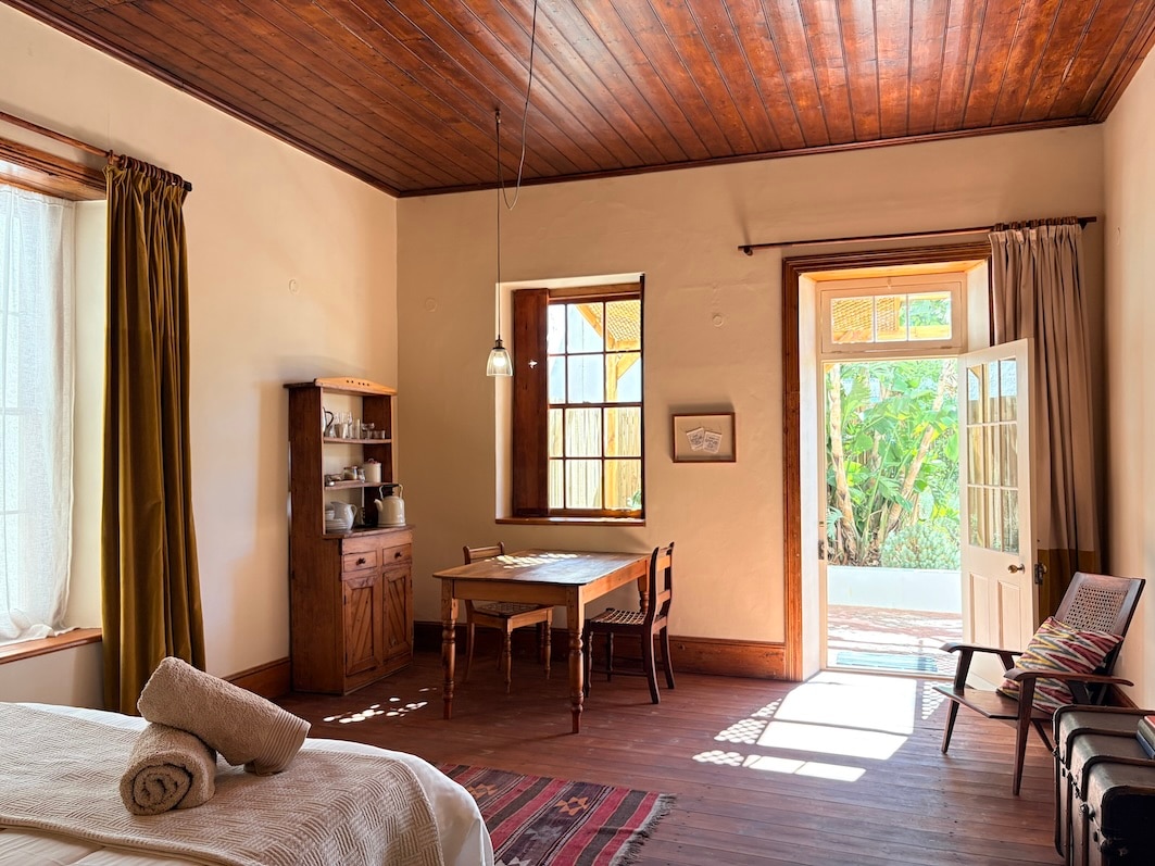 The Karoo-style Cottage Suite sleeps two and is tucked away in the pretty gardens behind the main house at Casa Milorca, which was built in 1860 and is situated in one of Prince Albert's prettiest streets in the historic heart of the town. The cottage has a king-size bed with quality white bed linen, and there is an en suite bathroom with shower, as well as a compact lounge and dining area. The kitchenette area has washing up facilities, a toaster, kettle, microwave and bar fridge, and basic kitchen utensils. There is also a tea and coffee station with home-baked rusks. The Cottage Suite, which has its own private verandah, can also be configured with two single beds instead of a king-size bed. Thanks to air-conditioning the cottage is cool in summer and warm in winter; there is also has a standing fan if that is preferred.