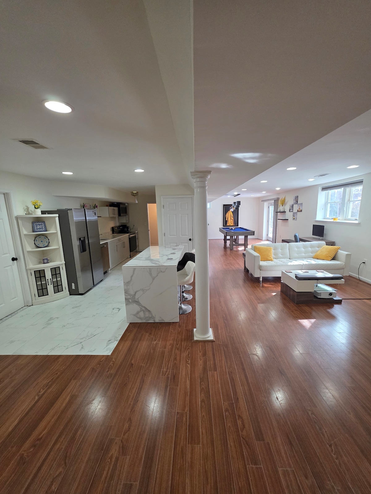 Enjoy a comfortable and private stay in this spacious one-bedroom basement guesthouse, perfect for couples, solo travelers, or business guests. The unit features a large bedroom with TV and 1.5 bathrooms, offering extra convenience and privacy. Relax in the cozy living area with a video projector and pool table. The fully equipped kitchen makes it easy to cook meals at home, and the in-unit washer and dryer provide added comfort for longer stays.